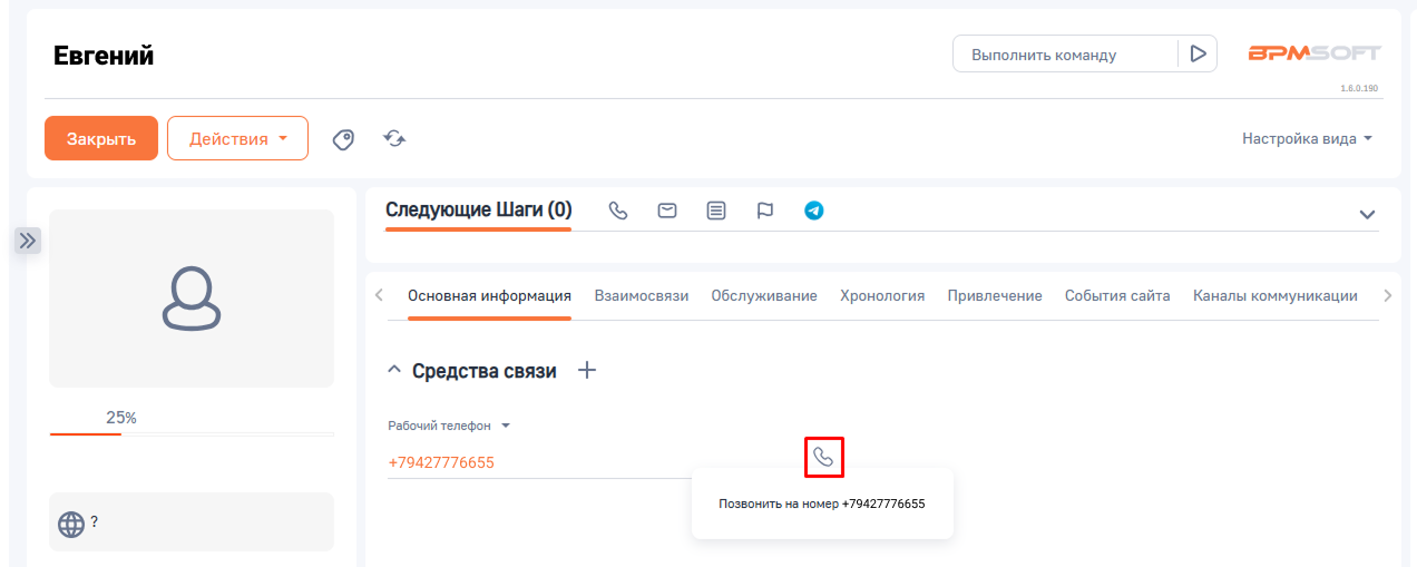Если сотруднику надо позвонить по ранее сохраненному номеру, он может совершить звонок в один клик из реестра записей или карточки контакта.