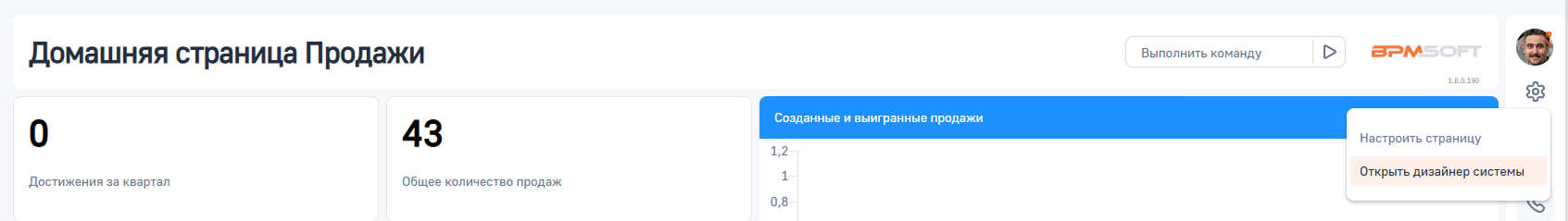 1. В BPMSoft в правом верхнем углу нажмите на шестеренку и выберите пункт «Открыть дизайнер системы»