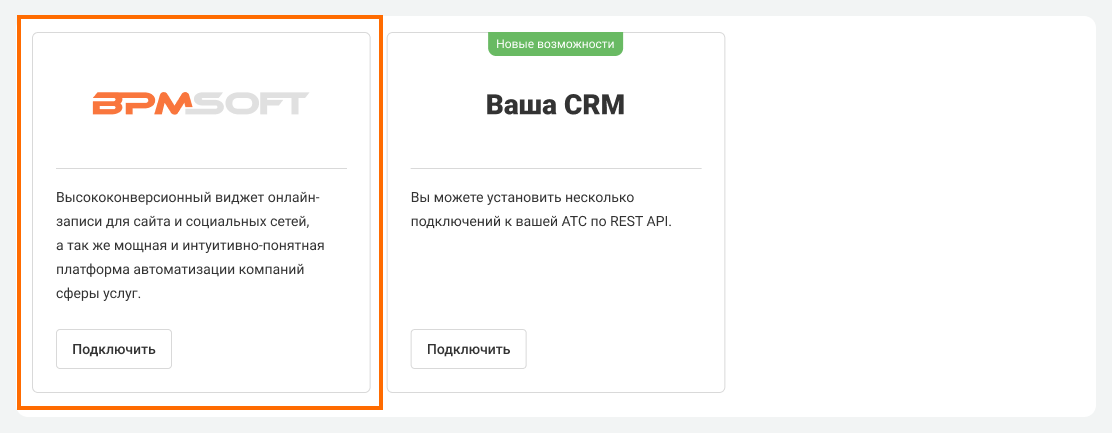 12. В вашей АТС зайдите в меню «Интеграция с CRM». Найдите виджет BPMSoft и кликните на него.