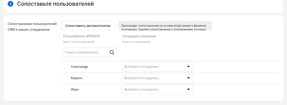 Это необходимо, чтобы системы могли однозначно идентифицировать сотрудников и правильно отражать связанные с ними события. В BPMSoft будут заноситься звонки только сопоставленных пользователей. Если в будущем вы добавите новых сотрудников, не забудьте сделать сопоставление в настройках интеграции из личного кабинета АТС.