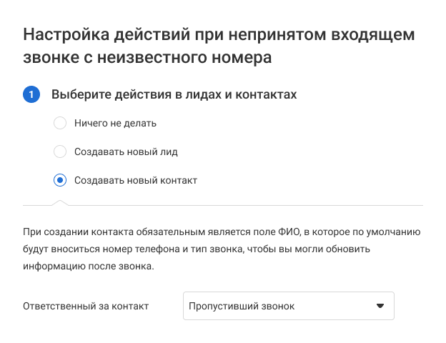 Также для отдельных типов звонков можно создавать контакты, задачи, обращения, а пропущенные в IVR можно фиксировать на конкретного сотрудника.