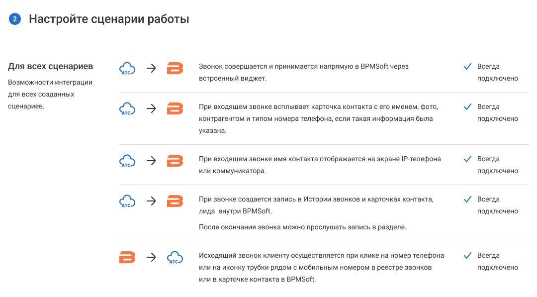 15. Настройте возможности интеграции для всех сценариев. Часть из них подключаются автоматически без возможности внести в них изменения, например, совершение и прием звонков через виджет в BPMSoft.