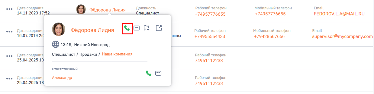 • Звонок ранее сохраненному контакту: нажмите на номер телефона контакта наведите курсор на имя контакта . При появлении карточки контакта нажмите на зеленую трубку.