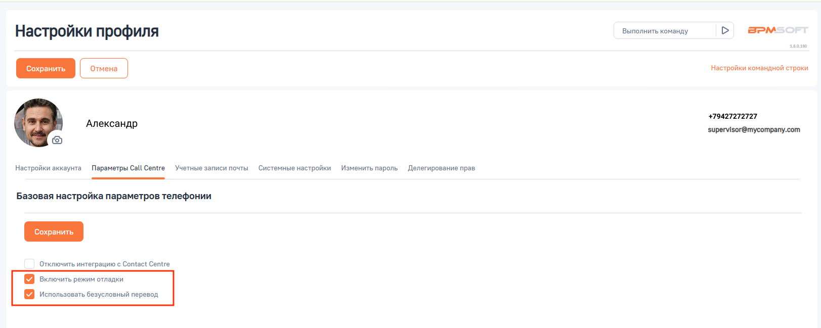 2. В настройках профиля перейдите на вкладку «Параметры Call Centre» и поставьте галочки у пункта «Включить режим отладки».