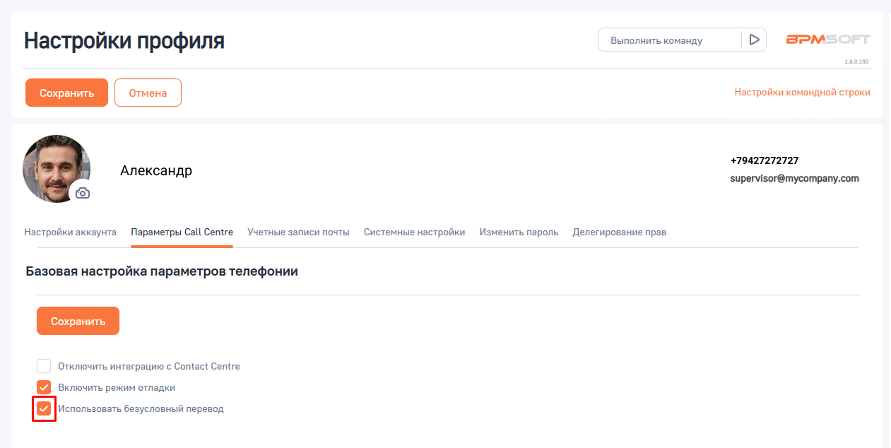 • Проверьте, что в настройках профиля на вкладке Call Centre в интерфейсе BPMSoft стоят соответствующие галочки (описано выше).