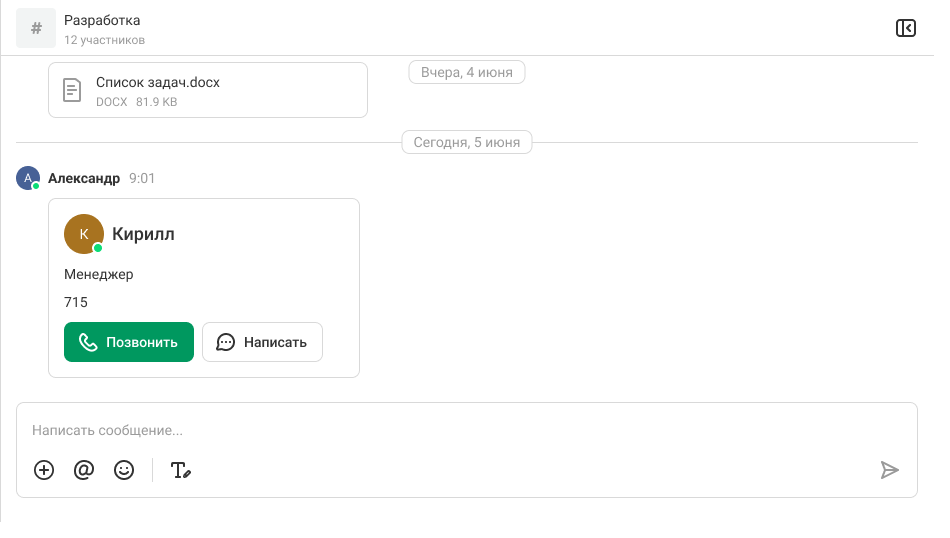 Чтобы узнать, доступен ли коллега для оперативной связи, обратите внимание на статус его присутствия в мессенджере. Этот статус отображается в карточке сотрудника, также его можно посмотреть в списке чатов.