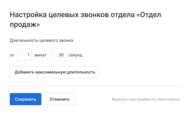 По умолчанию целевыми считаются звонки длительностью от 1 мин. 30 сек. Чтобы это изменить, нажмите на кнопку «Настроить целевые звонки».