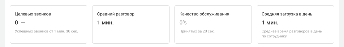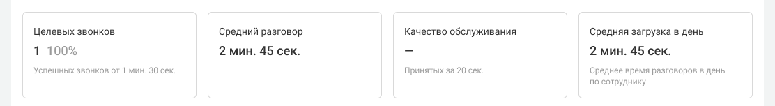 • Средняя загрузка за день: 2 мин. 45 сек. Считается по всем сотрудникам, которые участвовали в успешных звонках отдела. В нашем случае это оба сотрудника.