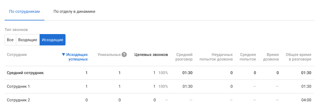 • Средний разговор и Общее время разговора — 1 мин. 30 сек. у первого сотрудника, так как это был единственный звонок за день. У второго сотрудника отображается только общее время в разговоре (4 мин.), так как средний разговор считается только по данным успешных звонков сотрудника.