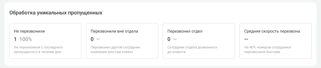 • Перезвонил отдел — количество и доля уникальных номеров среди пропущенных отделом, по которым состоялся успешный перезвон сотрудниками отдела.