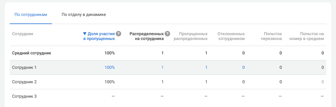 • Доля участия в пропущенных: 100% у сотрудника 1 и сотрудника 2. Они оба могли ответить на вызов, пока сотрудник 3 был на звонках.