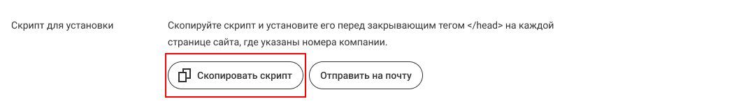 Скопируйте код для подбора номеров и установите его перед закрывающим тегом </head> на каждой странице, где требуется подбор номера. Для этого нажмите на кнопку «Скопировать код». Это поможет своевременно узнавать о возникновении ошибок в работе коллтрекинга.